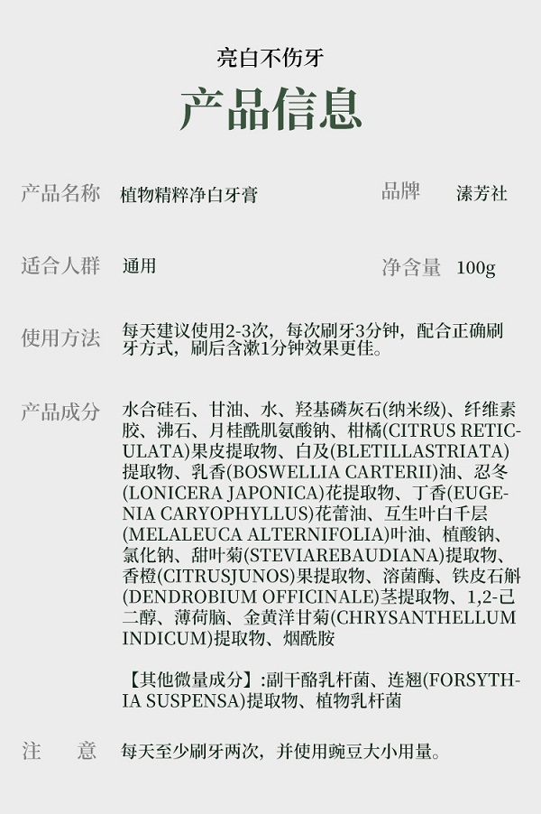 品名:溸芳社植萃精油氨基酸多效牙膏