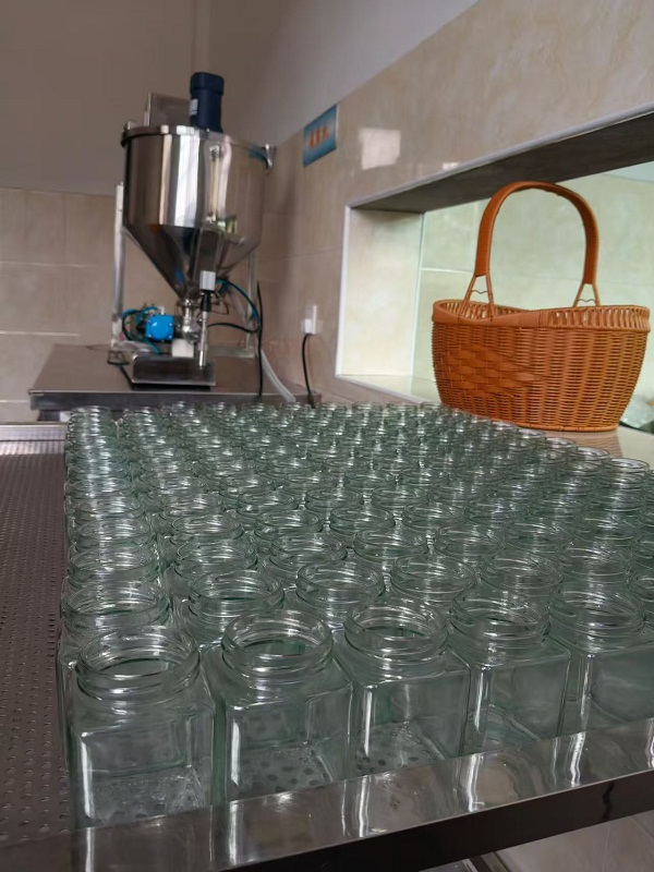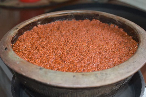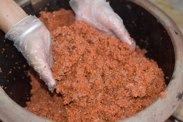 这款桂花酱的原料从摘花、择花全靠人工。用桂 叶轻轻地将鲜桂花与杂质分离开,用糖层层秘 制,一层桂花,一层糖,压紧压实,储在缸里慢 慢腌制1个月以上才成品,匠心独具,桂花酱色泽 深红,甜蜜芳香。