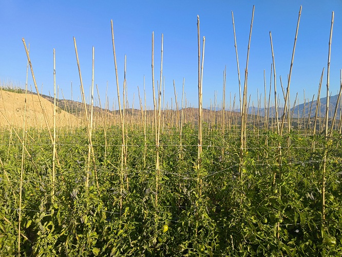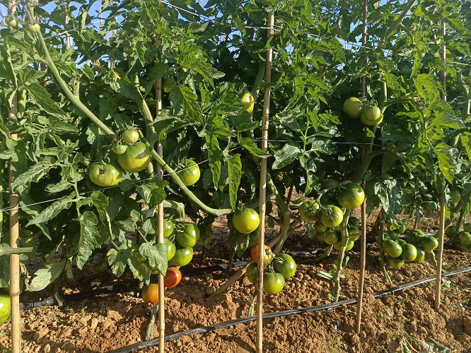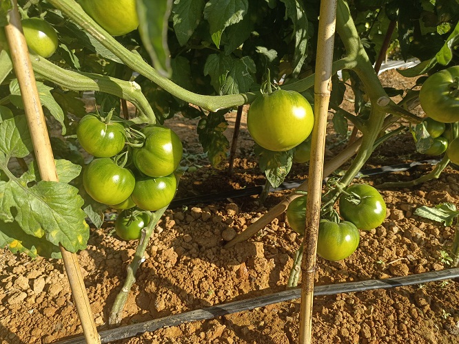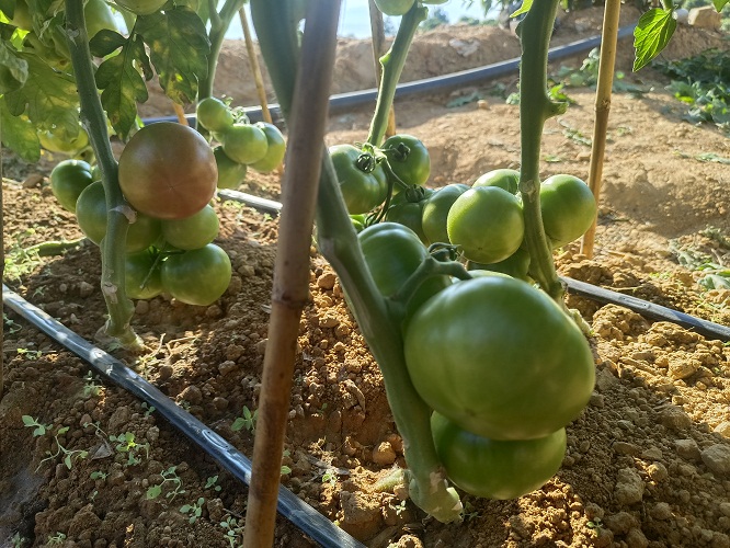番茄整个过程中,不使用任何化学合成的激素(生长调节剂),例如保花保果剂、膨大剂、防脱剂、催熟剂等,授粉采取自然授粉+震动棒辅助授粉方式。
