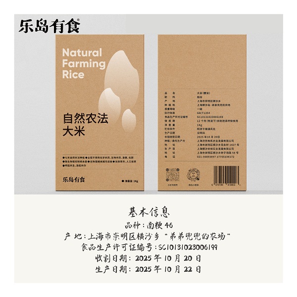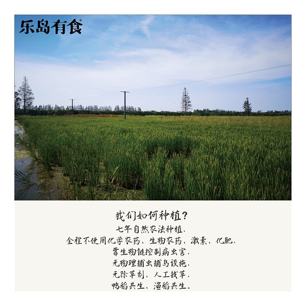 农场处于上海崇明三岛之一的横沙岛,它是长江入海口的最后一个岛屿,历来没有工业,至今还需要通过车船渡才能到达。横沙岛的空气质量是全上海最好的,同时农产品94%以上达到绿色标准,整体的土壤和水源情况,在长三角地区的平原地带,属于较好的水准。今年是农场按照自然农法实践的第五年,在此农场向您郑重承诺:我们种植的水稻为一季稻,品种是南粳46,我们的水稻生长全过程,完全不使用除草剂,不使用化学及生物农药,不使用化肥。45亩水稻田耗费1200小时的人工拔草,同时采用鸭稻共生,在人工初步拔草结束后,在稻田投放小鸭子,密度约为10-12只/亩,小鸭子一边除草一边施肥。肥料的来源有这样几个方面:1、冬天种植蚕豆和紫云英,根部有固氮作用,作为水稻氮肥的一个来源;2、菜籽和骨粉,混合搅拌发酵后,作为基肥和追肥使用;3、剩余瓜果蔬菜制作的酵素,投放到稻田周围的环沟,兼顾水体净化、增加微生物菌落,增加稻田生态系统的生物活性。南粳46的稻米,米饭口感软糯,煮的粥米油丰富,米香浓郁。我们采用10斤的真空包装,便于仓库保存,运输过程颠簸和碰撞可能造成真空失效,但完全不影响米的食用状况和口感。请大家放心!