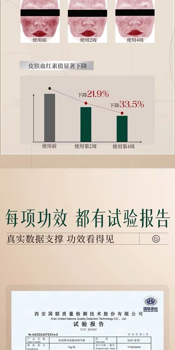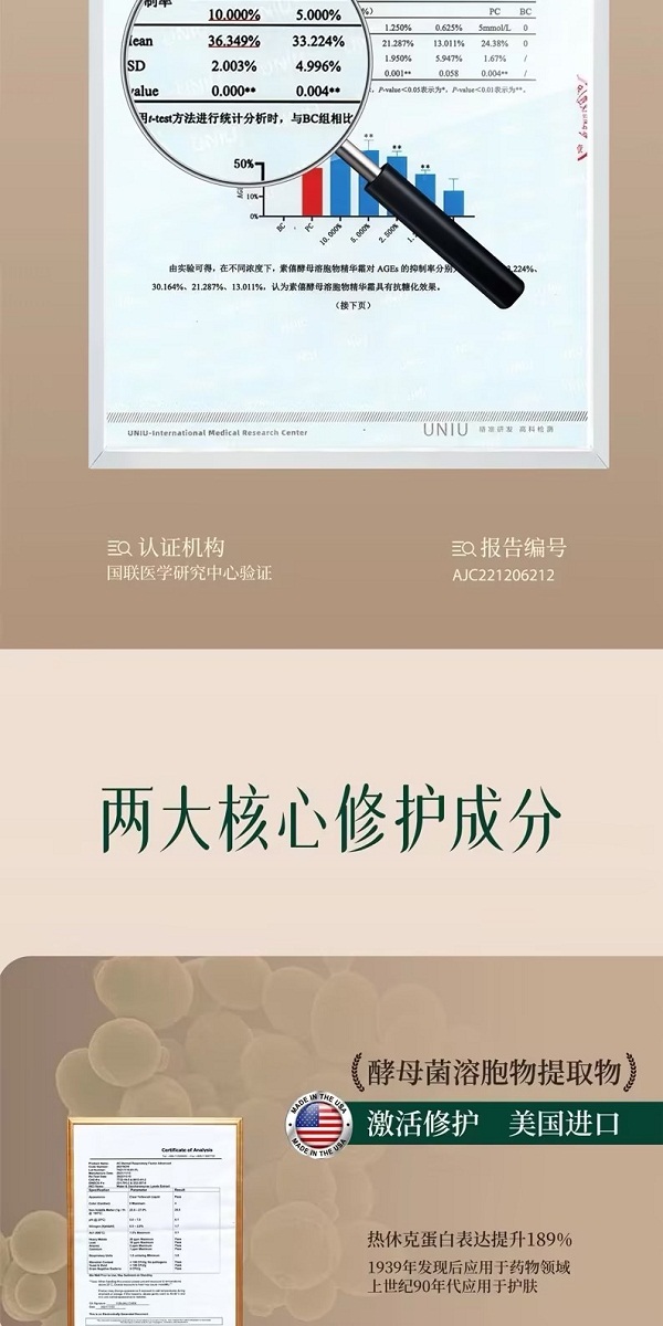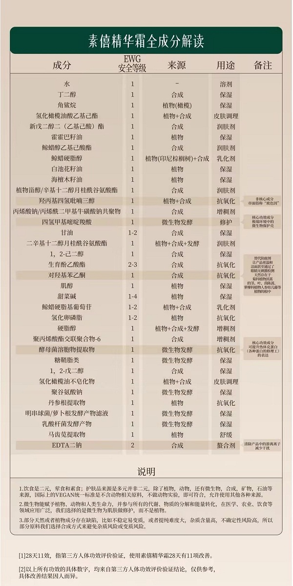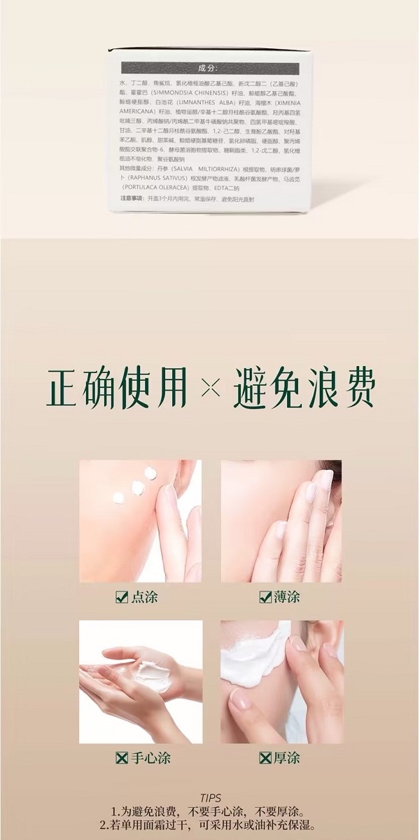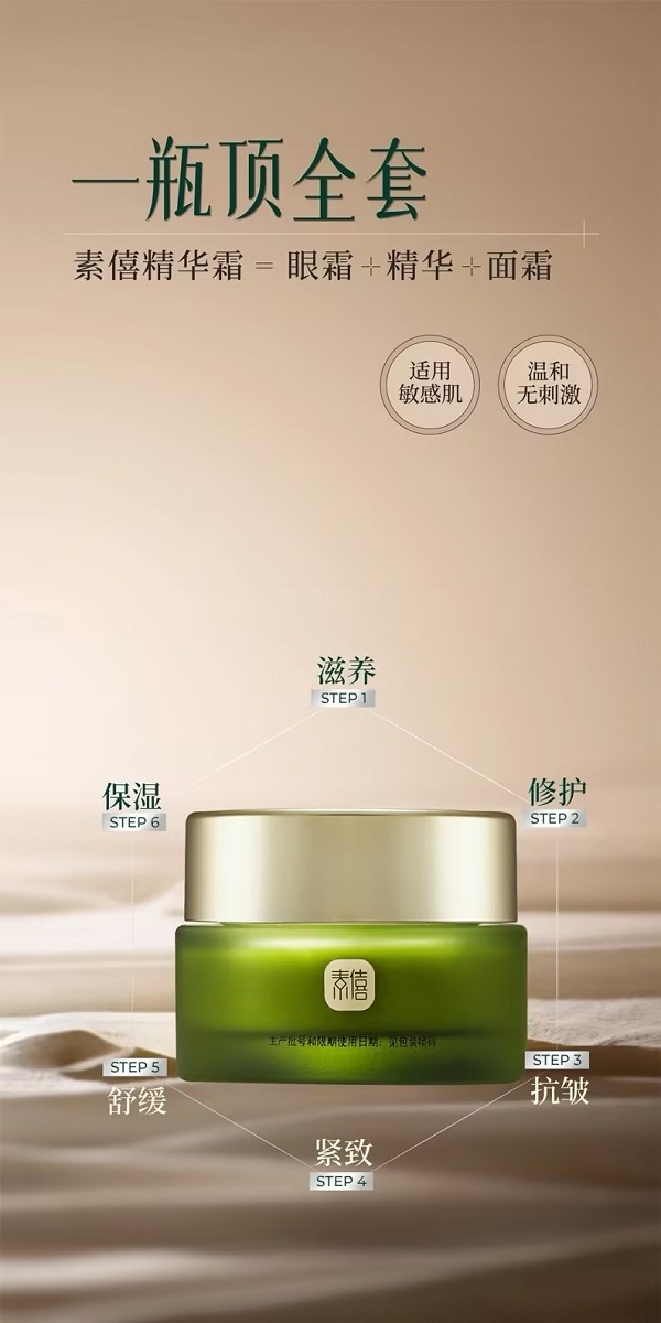 说明:素僖酵母溶胞物精华霜,堪称全能型面霜,集滋养、修护、保湿、抗皱、紧致、舒缓等多种功效于一身。它仿佛肌肤的忠诚“守护者”,全方位呵护肌肤,保持健康年轻态。这一瓶可替代精华、眼霜等,简化护肤步骤,节省时间。