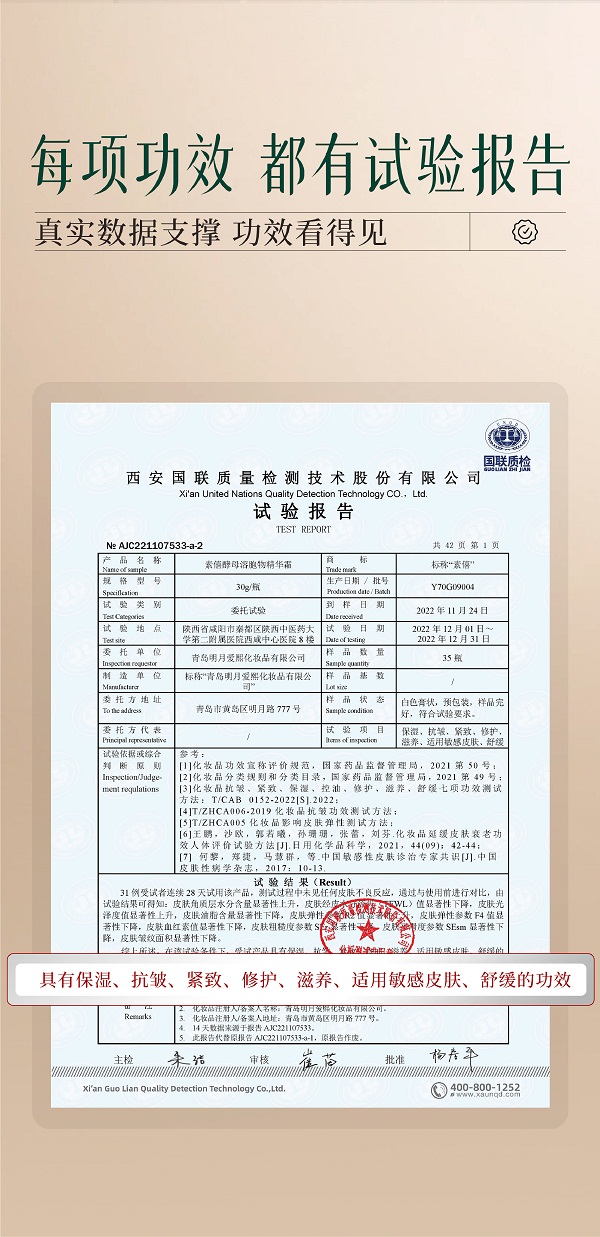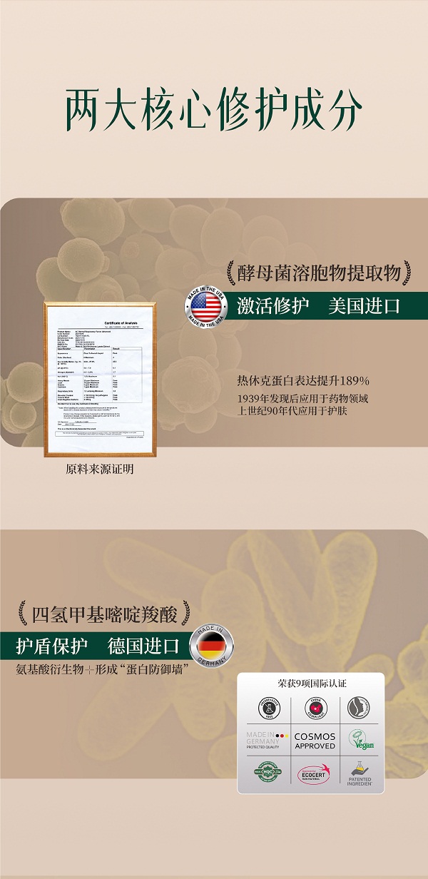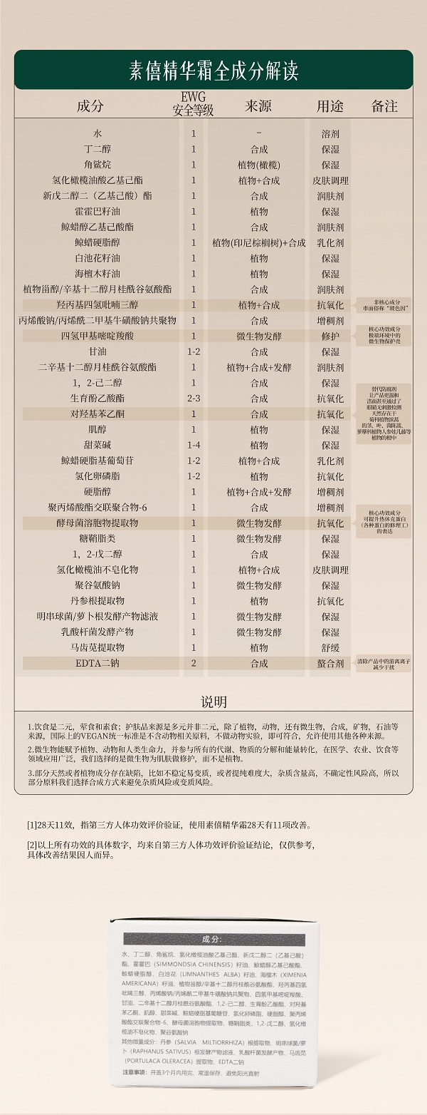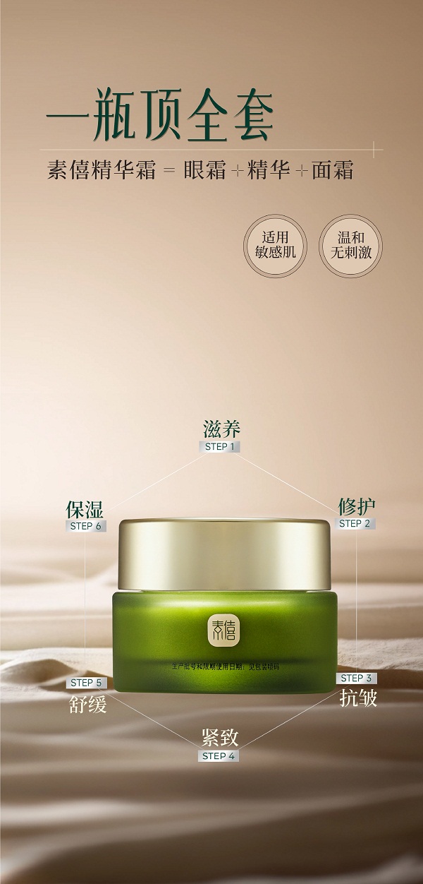 说明:素僖酵母溶胞物精华霜,堪称全能型面霜,集滋养、修护、保湿、抗皱、紧致、舒缓等多种功效于一身。它仿佛肌肤的忠诚“守护者”,全方位呵护肌肤,保持健康年轻态。这一瓶可替代精华、眼霜等,简化护肤步骤,节省时间。