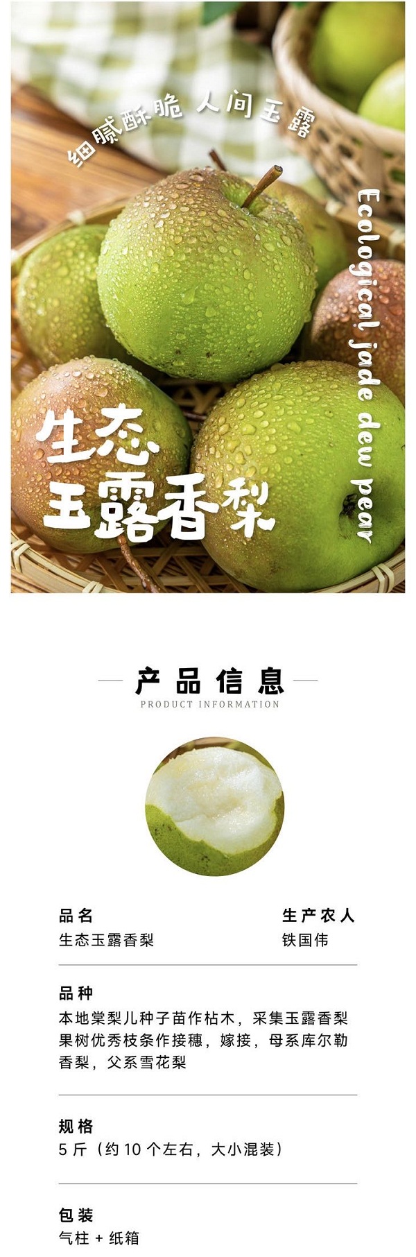 玉露香梨,是库尔勒香梨和雪花梨的梨娃娃,继承爸妈的优良特性。