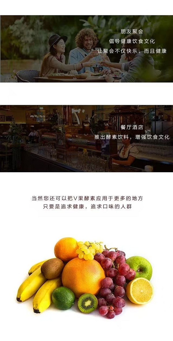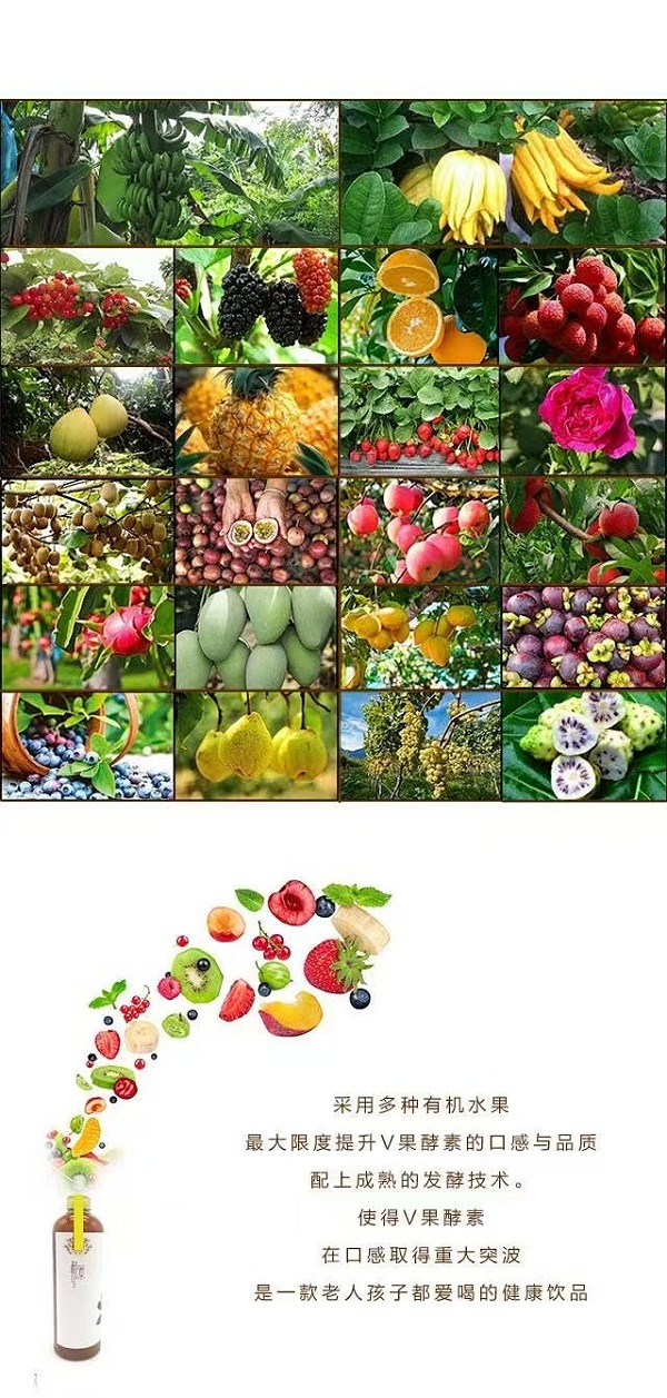 V果:富含维生素的多种水果,本酵素采用多种富含维生素的有机水果发酵而成
