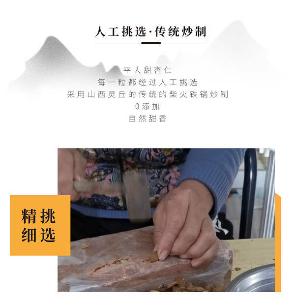 答:第一种情况是苦杏仁:因为甜杏仁在山上会有和苦杏仁靠的比较近的时候,杏仁成熟落到地上,捡杏仁可能会混在一起,我们会挑出来,极少数会有遗漏的;第二种情况是火候大:因为杏仁是柴火铁锅人工炒制,不是工厂统一的低温烘烤,所以偶尔会有火候偏大,吃起来有些微苦。