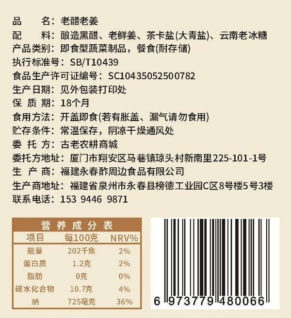 配料:桃118园自种老姜;古法酿造老黑醋;云南老冰糖;茶卡盐(冰糖降低辣度,盐为了改善口感,添加量都很少)