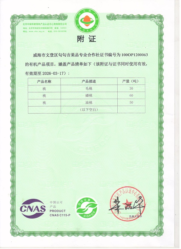 多年来合作社大力实施 “勾勾吉”牌鲜桃战略,打造有机~健康~优质鲜桃的消费理念,以有机安全为特色逐步向产业化方向发展,2011年成功被中绿华夏认证为有机食品,至今已连续续展15年。2013年在山东广播电台农科频道举办的规模种植状元大赛被评为优胜奖,2014年被评为威海知名品牌。2016年被山东省质量强省及名牌战略推进工小组评为农业技术推广服务山东名牌,同年被中国长寿之乡绿色发展联盟认定为中国长寿之乡名优产品,2018年被山东省农业厅、山东省工商行政管理局、山东省财政厅评为家庭农场省级示范场。勾勾吉”系列桃采用生态有机的管理方法 ,喝着天然泉水,吃着沼液沼渣,生产出来的鲜桃品质优良 ,口感好,可溶性矿物质含量 高达14%以上。