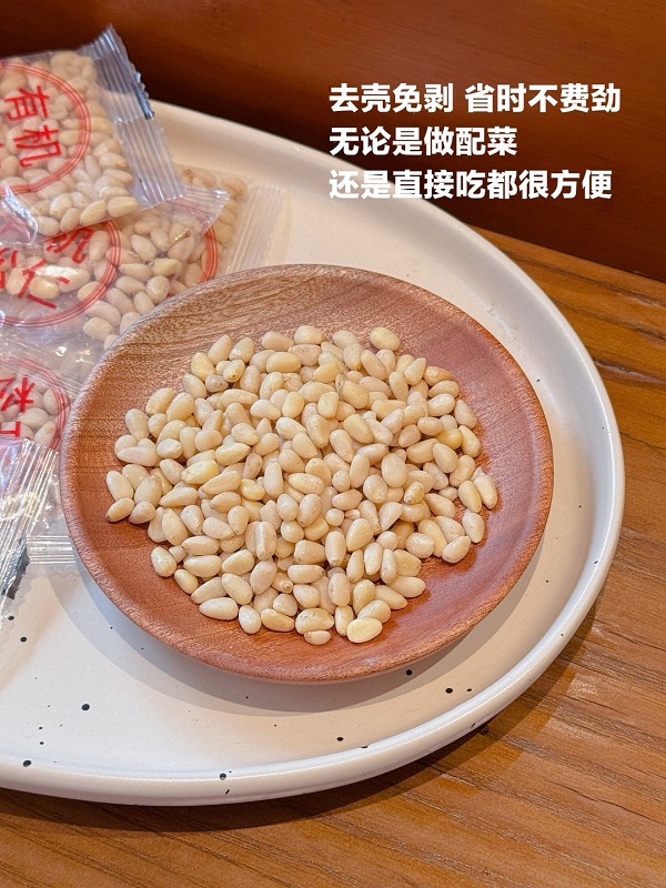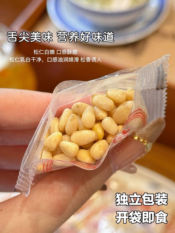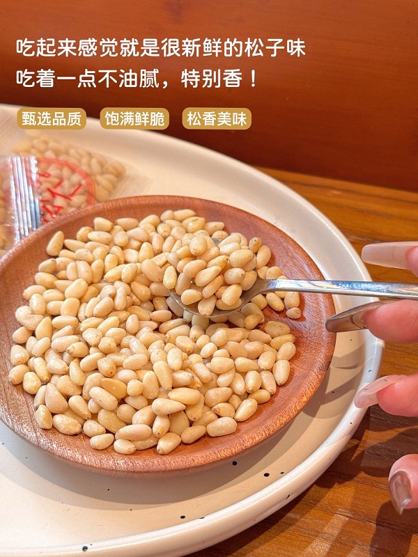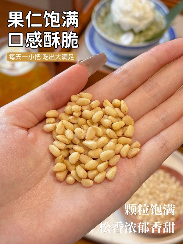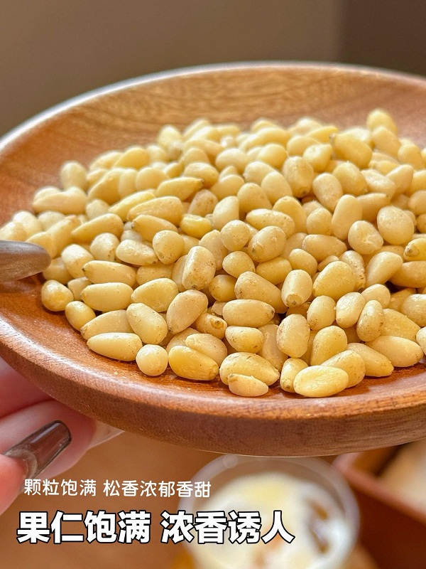 颗粒大小均匀、白、甜。相比其他品种的松仁