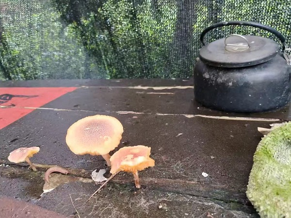 果园是菌类的天堂,土表层遍布白色菌群,果园寮房的门板上也长上了