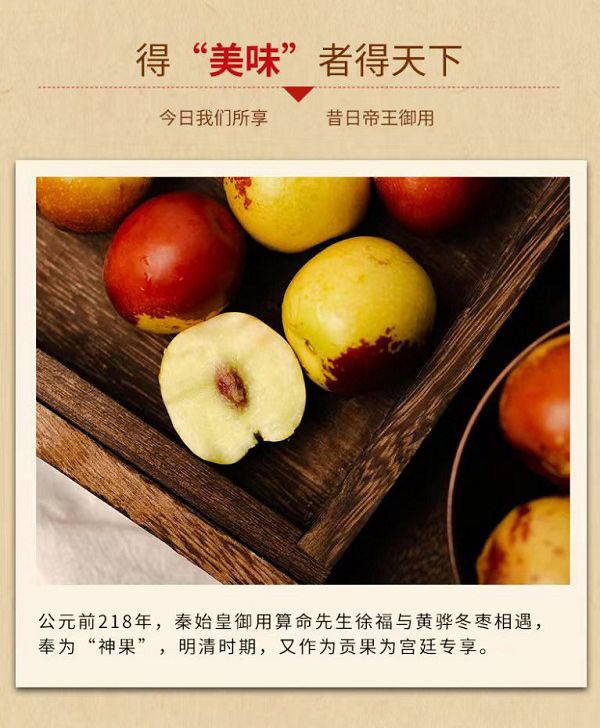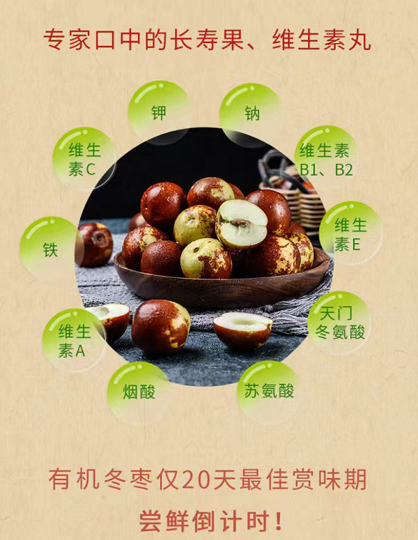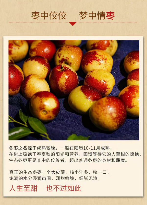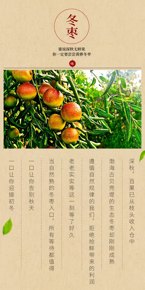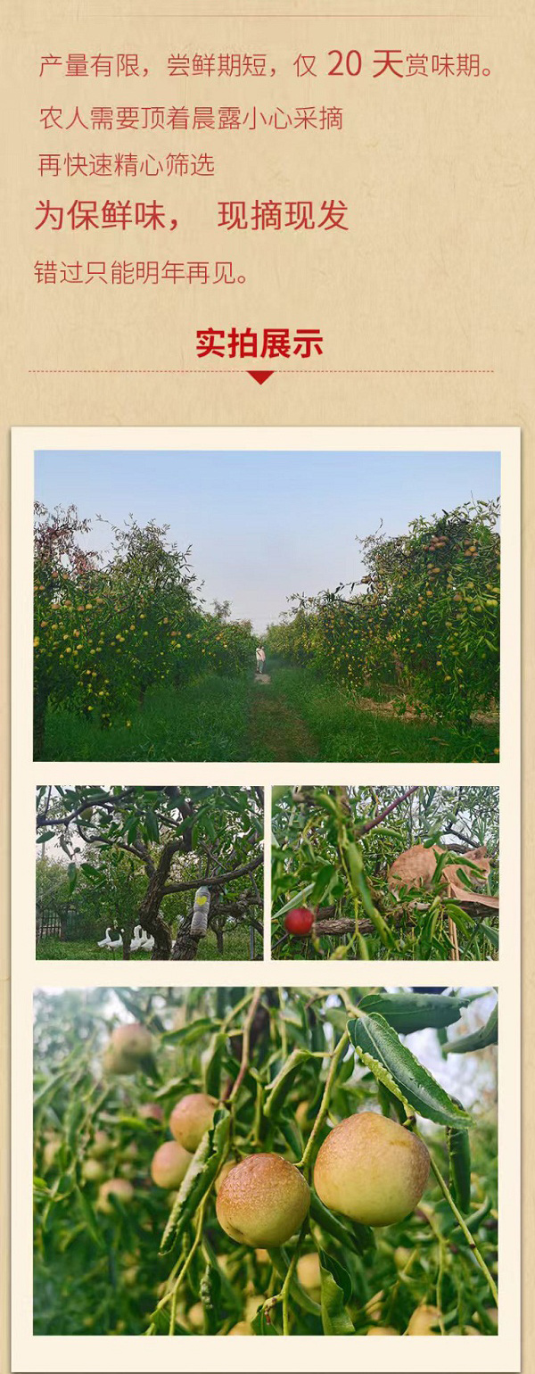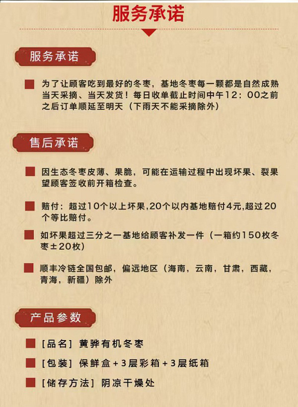 关于发货: 十月冬枣口感最佳,冬枣现摘现发,顺丰冷链发货,因采摘分拣需要一定时间,遇雨天订单顺延,新疆西藏青海海南云南不发货